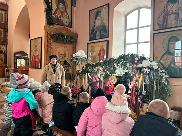 Матушка Лариса Гладунец, с любовью и простотой, рассказала детям о великом празднике Рождества Христова — о том, как Бог, ради спасения мира, пришёл в мир в виде младенца, чтобы научить нас любить и быть милосердными. Она объяснила значение вертепа, традиции пения колядок и дарения, как проявления благодарности.